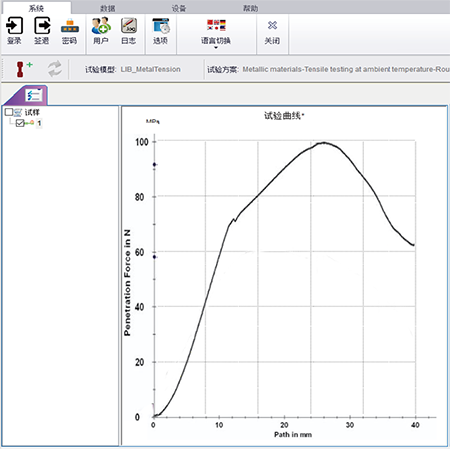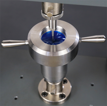 In this test, a strip-shaped specimen is clamped on the lower specimen holder. It is punctured by a replaceable probe from above, and the maximum penetration load is measured.